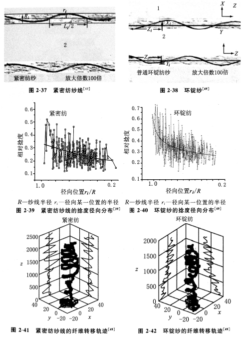 图2—37和2—38给出了示踪纤维在紧密纺纱线和环锭纱中的轨迹。图2—37中,ri表示示踪纤维波峰/波谷处的径向位置;Li/2表示示踪纤维在径向位置ri处的半螺距。图2—38中,X/,yi和Zi表示i点的空间坐标位置。图2—39和2—40给出了紧密纺纱线和环锭纱的捻度径向分布。两种纱线的捻度都是沿着纱线径向由内向外逐渐增大,而且纱线的轴心线都不存在捻度。然而,紧密纺纱线的捻度径向分布曲线较为平滑,其纤维的内外转移程度也低于环锭纱。