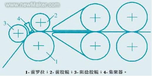 除罗拉与前胶辊组成前钳口外,增加的阻捻胶辊则与前罗拉形成阻捻钳口。二钳口之间为纤维须条的集聚区,在前胶辊和阻捻胶辊之间装有集聚器,它依靠自身的磁铁性能吸附在前罗拉钳口表面,其底部中心有一开口凹槽,形成截面渐缩形的纤维通道,须条和前罗拉同步移动。集聚器有多种规格,纺纱时可根据纱支和品种变化来更换凹槽不同的集聚器。
