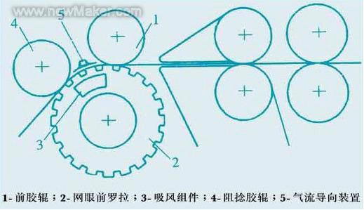 在集聚区的网眼前罗拉外侧还装有气流导向装置。网眼前罗拉分别与前胶辊、阻捻胶辊组成前钳口和阻捻钳口,二钳口之间为集聚区;吸风组件通过网眼前罗拉的网眼抽吸气流,使网眼前罗拉表面的纤维集聚,集聚后的纤维带被输出到阻捻钳口后被加捻;网眼前罗拉表面为凹凸形沟构,改善了对纤维的握持效果,并能防止纤维粘附。