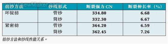 可见,管纱和筒纱,紧密纺强力比环锭纺提高10%左右;管纱的断裂伸长相近,紧密纺筒纱伸长略大于环锭纺。