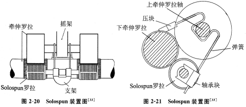 如图2—19和2—20所示,SotospunTM的附力口装置由一对固定于支架上的罗拉组成。该支架夹持在前罗拉的轴上。每个支架都有弹性,一端装有一个压块,另一端为SolospunTM罗拉轴承。支架的钳口通过压块推力固套在前罗拉轴上(图2—21)。