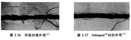 采用意大利FILATOIO毛型小样细纱机,程等人[37]分别纺制了Solospun纱和环锭精梳纱,线密度35.7tex(28Nm),设计捻度610捻/m。测得两种纱线的毛羽数,如表2—7所示;纱线外观分别如图2—26和2—27所示。结果表明,So-lospun纱的毛羽数明显少于环锭纱。