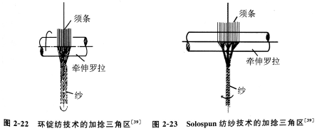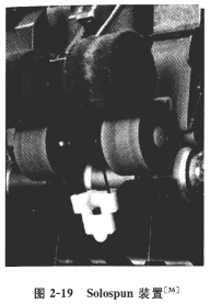 SolospunTM[33-35]可以纺制出可直接用于织造的经纱或纬纱。该技术利用安装至环锭纺细纱机上的简易附加装置,其成纱过程改变了纱线结构。SolospunTM纱线的耐磨性可以与双股纱相媲美,但极大地降低了加工成本。