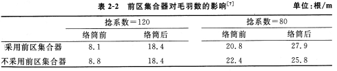 在传统的纺纱方法中,前区集合器将纤维凝聚,使得纤维更容易被转动的须条捕获,因此减少表面毛羽。但是,在双须条纺纱中,上述行为可能减少由类似纱线成形模式捕获的纤维数量。表2—2列出了采用和不采用前区集合器条件下络筒前后的纱线毛羽数(线密度60×2tex,须条间距14mm,采用两种捻系数)。