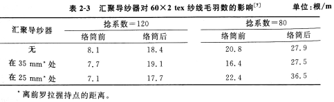 对于汇聚导纱器安装在须条自然汇集点上方的情况,在络筒前进行测试,通常可观察到成纱毛羽数有所减少,但成纱耐磨性和强度无变化,如表2—3所示。