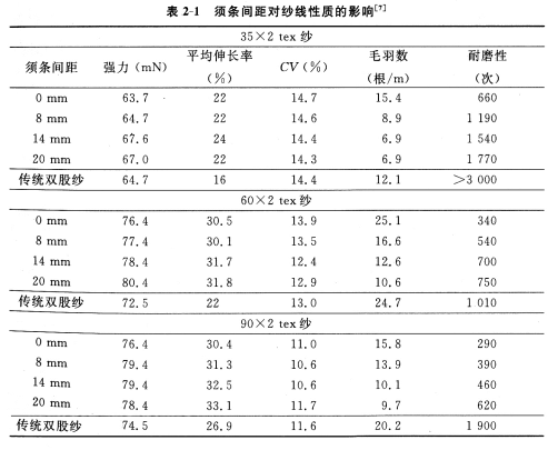 表2—1中,分别给出了双须条纱35×2tex、60×2tex和90×2tex的性质及其须条间距之间的关系,纱线原料均为纯羊毛,公制捻系数为120。作为比较,表中也包括了由相同粗纱纺制的传统双股纱(单纱捻系数为90,双股捻系数为120)。