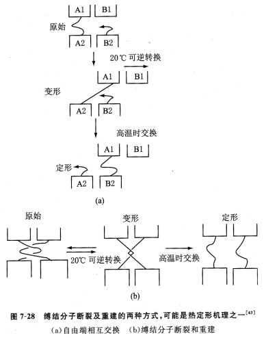 热定形也可能与结晶区无关,而是由于非晶区的缚结分子断裂和重新排列,如图7—28所示。大分子链在应力作用下可能断裂,并在新的位置重新排列,从而形成稳定的结构。这种过程在涤纶纤维中比在锦纶纤维中更可能出现,并可以解释为什么在相同或更低的温度下能进行二次定形。涤纶大分子在熔融状态下,由于热振动可发生大量酯交换、酯键断裂和重建[45]。
