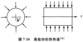 纱线在加热区内加热时,热流从纱线表面流向纱线中心,因此,在纱线表面和中心之间存在温度梯度。根据热传递基本原理,将高捻纱视为实心杆(见图7—24);并作进一步简化,可得到以下式子: