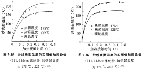纱线与加热器的接触时间取决于纱线速度和加热器的长度,一般在0.2~0.5s的范围内变化。在这么短的时间内,纱线温度必须升高至200℃左右。纱线与加热器接触的同时,由于加捻而高速回转。此外,除了与加热器接触加热,纱线也受周围表面的热辐射作用以及加热器表面的热空气的加热作用。由于以上热作用,纱线四周受热均匀。
