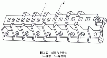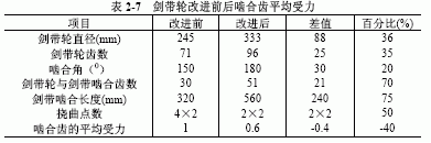 剑带与剑带轮的啮合角通常为1200~1800。剑带轮的大小及啮合形式是造成剑带磨损的主要原因之一。表2-7所示为剑带轮改进前后啮合齿平均受力实例。剑带轮直径增加,剑带包围在剑带轮上的曲率半径减
