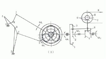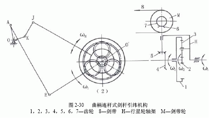 如图2-30所示为曲柄连杆式剑杆引纬机构示意图。六连杆送纬剑杆引纬机构如图2-30(1)所示,主轴O转动,分别带动六连杆机构和四连杆机构的曲柄OA、OK,经杆件分别往复传动周转轮系中的齿轮1和行星轮轴架H,在齿轮1和行星轮轴架H的作用下,齿轮2作往复转动,并通过伞齿轮4、5、6、7带动剑带轮M往复回转,从而使剑带8作往复直线运动,完成剑杆的引纬工作。