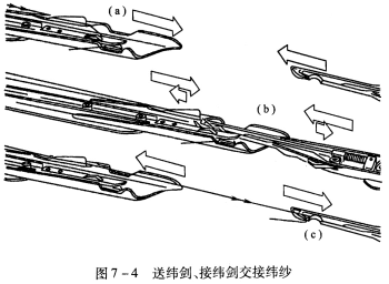 送纬剑和接纬剑的剑头分别是可打开或夹持纬纱的叉形钳口和钩形钳口,进剑过程中,纬纱在张力作用下滑人送纬剑的钳口,由纬纱剪刀将钳口与布边之间相连的纬纱剪断,送纬剑夹持着纬纱的纱端到达梭口中央与接纬剑相遇,纬纱自动滑人接纬剑的钳口中,再由接纬剑夹持引出梭口。纬纱的交接过程如图7—4所示,图7-4(a)是交接前纬纱由送纬剑的钳口夹持的情况,图7—4(b)是交接中两剑头有一定的重叠动程,图7—4(c)是交接后两剑杆回退时接纬剑夹持着纬纱。