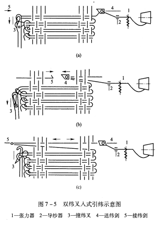 图7—5所示是双纬叉入式引纬的过程。送纬剑头呈叉状,接纬剑头为钩状,纬纱以圈状挂在送纬剑的叉口中被送人梭口;在梭口中央,纬纱圈滑入接纬剑的钩头中,接