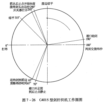 织机各机构的运动配合可在主轴回转一周的工作圆图上表示,以打纬终了时为0°。剑头进梭口时间约在60°~80°,出梭口时间约在280°-300°,剑头在梭口中运动的时间较长,约占主轴转角200°,某些机型甚至达250°。剑杆织机的综平时间比有梭织机迟,约在300°以后,筘座在后心附近的静止角也大大增加,最多达230°。为使纬纱在梭口中能跟踪交接,送、接纬剑进足时的时间差宜控制在10°左右。选纬则一般配置在前一纬引纬末,即前止点附近开始供给纬纱,而在剪纬前终止,剪纬时间多在70°左右。
