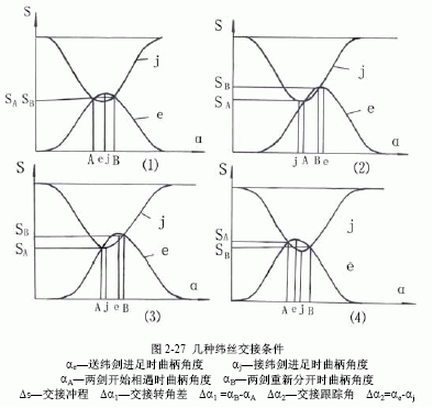 (2)αj≤αA<αB≤αe,Δα1>0,Δα2>0,Δs>0,如图2-27(b)所示。纬丝交接过程始终位于送纬剑的进剑阶段和接纬剑的退剑阶段,任意时刻两剑的运动方向相同,这种跟踪交接使两剑相对运动速度较小,纬丝交接的冲击张力小,同时,由于送纬剑继续进剑,直至纬丝交接完成,因此,纬丝在完全转移到接纬剑之前由送纬剑控制而张紧。这是一种理想的交接条件,被新一代的剑杆织机广泛使用。