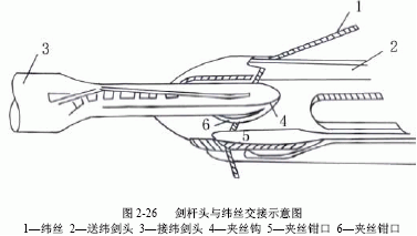 双剑杆引纬过程中,在织机中央发生纬丝在送纬剑和接纬剑之间交接。如图2-26所示为剑杆头与纬丝交接示意图。在纬丝1交接时,接纬剑头3进入送纬剑头2内腔,纬丝滑过接纬剑头的夹丝钩4,当接纬剑后退时,纬丝脱离送纬剑的夹丝钳口6,进入接纬剑的夹丝钳口5,完成纬丝的交接。