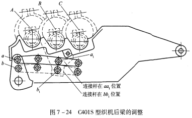 后梁及经停架的前后位置决定了后部梭口的长度,C401S型剑杆织机后梁的前后位置分A、B、C三挡,如图7—24所示。当后梁及经停架前移时,后部梭口的长度缩短,上、下层经纱的张力都增大。后梁及经停架后移,则上、下层经纱的张力都减小。当织造经向和纬向紧度较高的织物时,后梁应向前移,以增大经纱张力,使形成的后部梭口较为清晰,减少断头后相邻经纱的纠缠,经停片的跳动也较为灵沽。当织造强力较低的细特、轻薄织物时,后梁及经停架应后移,降低经纱张力,有利于减少经纱的断头。