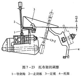 2.综框高低位置的确定综框在最低处时,综眼低于走剑板表面的切线延长线KK′约2mm,如图7-22所示。