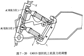 VamatexC401S型剑杆织机上机张力的调整如图7—20所示,旋转手轮x,可改变张力弹簧Y的位置。张力弹簧处于位置B时,因力臂较短,上机张力小。处于位置A时力臂较长,上机张力大。如果弹簧在位置A时上机张力还不够大,则将连接杆(图7—21)从aa1位置移到bb1位置。如果弹簧在位置B时张力仍然太大,则在cc1位置上(图7—20)加吊弹簧。