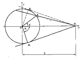 钳板前后摆动的规律主要取决于钳板摆轴的摆动规律。为了便于分析,将图4-4-9中的滑杆刚体内扣除边长为38mm的矩形后简化为图4-4-12。设O为锡林轴心,O1为钳板摆轴轴心,B1、B2分别为钳板的前死心位置与后死心位置,θ为某分度曲柄OA与X轴的正向夹角,