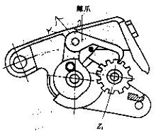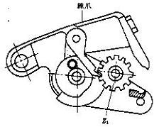 SXF1269A型精梳机配有前进给棉机构(见图4-4-3)和后退给棉机构(见图4-4-4)供选用,以适应各种精梳产品的不同质量要求和落棉控制。采用前进给棉机构,当钳板前进时上钳板逐渐开启,带动装于上钳板上的棘爪将固装于给棉罗拉轴端的给棉棘轮Z2拉过一牙,使给棉罗拉转过一定角度而产生给棉动作;当给棉罗拉随钳板后摆时,棘爪在棘轮上滑过,不产生给棉动作。如果采用后退给棉,可换上后退给棉机构,如果4-4-4所示;当钳板后退时上钳板逐渐闭合,带动装于上钳板上的棘爪将固装于给棉罗拉轴端的给棉棘轮Z2撑过一牙,使给棉罗拉转过一定角度而产生给棉动作;当给棉罗拉随钳板前摆钳口打开时,棘爪在棘轮上滑过,不产生给棉动作。