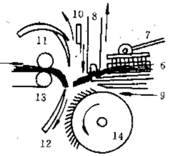喂入机构:包括条筒喂入架、导条板、喂给罗拉、给进盒、给进梳。