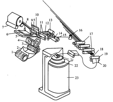 (5)出条机构——车面集合器、车面压辊、牵伸罗拉、圈条压辊、圈条器。