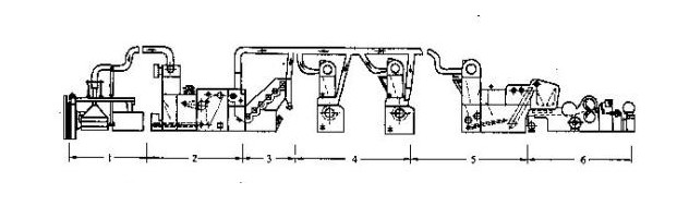 FA002圆盘抓棉机(2台)®FA12除金属杂质装置®FA104六辊筒开棉机æ(+A045凝棉器)®FA022多仓混棉机®FA106豪猪开棉机æ(+A045)®FA107豪猪开棉机æ(+A045)®A062二路电气配棉器®A092AST双棉箱给棉机(+A045)(2台)®FA141单打手成卷机æ(2台)