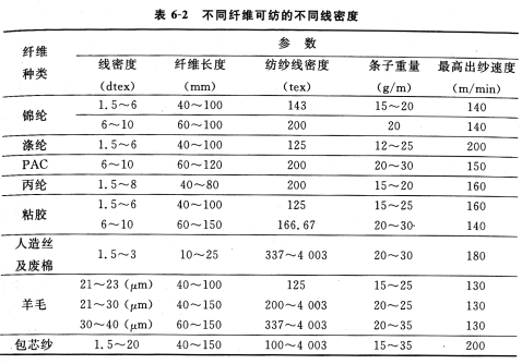 2)适纺线密度上述不同纤维可纺的不同线密度示于表6—2中。