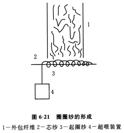 结子纱使纱线上呈现不均匀分布的小结子,圈圈纱则有大大小小的毛圈。只要在摩擦纺纱机上,使用一个大于出纱速度的超喂装置就可生产此种纱线。它由芯纱、外包纤维和起圈纱三部份组成。芯纱和外包纤维的喂给在原摩擦纺纱机上进行,起圈纱则另由超喂装置供给,超喂速度高出纺纱速度20%~60%。超喂速度高出20%,外包纤维和起圈纱的比例为70:30,能纺出结子纱;超喂速度高于60%,则纺出圈圈纱。不同超喂速度得到不同形式的花色纱,图6—21为圈圈纱形成的示意图。