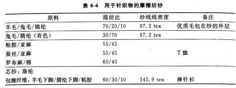 表6—4所示为用于针织物的摩擦纱。利用摩擦纱的分层结构特点,纺制不同结构的针织用纱,如优质毛位于外层的针织毛纱。外层捻度低,有利于后整理缩毛面积,绒面丰满蓬松,保暖性好。