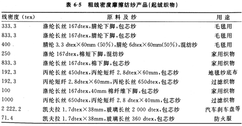 利用摩擦纺纱的结构分层特点、内紧外松、捻度内多外少、蓬松,具有良好的起绒效果,起绒织物保暖,手感丰厚、柔软,弹性好。纱体中纤维平行度差而更富有毛绒感。表6—5列出各种纤维纺制的特粗线密度的摩擦纺产品,多数可制作起绒织物。