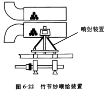 在摩擦纺机上加配一个纺竹节纱机构,它可以向楔形凝聚区间歇地喷射纤维,在纱中形成有规律或无规律的竹节,即竹节纱,还可以喷射彩色纤维,形成彩色竹节纱。如图6—22所示。
