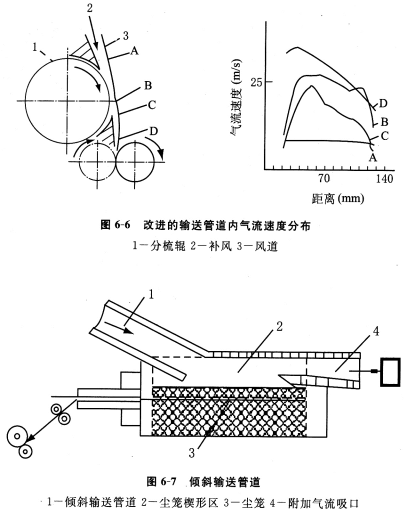 通过测定纤维输送管道内气流速度分布可以看出(如图6—5所示):气流速度自输送管道人口至出口是减速的,这对纤维伸直不利。C处的气流速度分布沿’纱轴方向接近均匀,可为均匀添加纤维到纱尾创造条件。因此,输送管道的设计应尽量使气流运动均匀分布且处于加速流动,有利于纤维伸直和添加到纱尾上。图6—6为改进的管道气流分布。