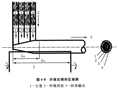 尽管纤维喂人楔形区的方式不同,好多根条子经开松后垂直喂入或倾斜喂入,但在楔形区,单纤维沿LA长度不断喂入到纱尾的同时,加捻成纱的纱条则连续不断地沿其轴向输出。在凝聚区长度LA上,纤维数量(或重量分布)沿纱条输出方向逐渐增加,纱尾各截面的直径也相应逐渐增大,外形是一端细另一端粗,类似“圆锥体”。