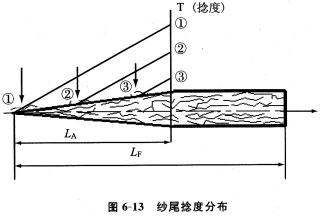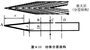 在纱尾形成过程中,新喂入的纤维在由细到粗的回转纱尾上不断形成层状的堆积层,纱体内纤维均沿着轴向层层排列,犹如许多锥体相套,成纱具有分层结构(如图6—11所示),这导致了纱尾加捻过程的复杂性及成纱经向捻度的不匀性。