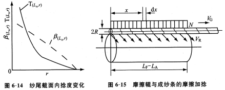 由此可见,纱条捻度的多少主要由尘笼转速决定,而纱体截面内的捻度分布,随r的变化沿径向自外向内不断增加,如图6—13、6—14所示。