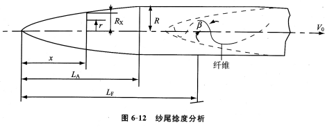 纤维在凝聚区长度LA内形成的纱尾,在一定的条件下,其外形近似抛物线。这种形状的纱尾在整个长度上通过摩擦传动加捻,纤维沿抛物线面呈螺旋排列,捻回角为β,如图6—12所示。