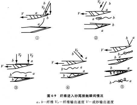 图6—9所示为纤维进入纱尾接触瞬间的可能变化情况,可以看出: