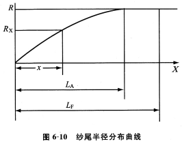 在凝聚区长度LA内,纤维数量沿纱尾长度方向的分布是不均匀的,其分布函数和曲线与纤维喂人方向以及其他条件有关,较为复杂,纱尾的几何形状更为复杂。但当成纱输出速度一定时,凝聚区内喂人纤维量是均匀的,在纱尾体积密度不变的情况下,纱尾的半径分布曲线(纱尾的外形)可视为抛物线,如图6—10所示。