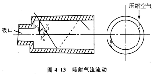 如图4—13所示,喷射孔与纱道内圆周相切,并与纱道轴线成α夹角。压缩空气由喷射孔射入纱道的速度为VJ,在纱道中形成旋转气流,可分解成两个分气流:旋转气流切向分量VT=VJsinα和旋转气流轴向分量Vs=VJcos