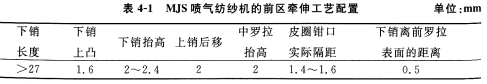 综合前区牵伸为:采用“双短皮圈配以零钳口隔距,下销抬高和中部上凸、上销后移,重加压、紧隔距”完成了对纤维的有效控制。这是喷气纺纱机超大牵伸的特殊工艺,工艺配置如表4—1所示。