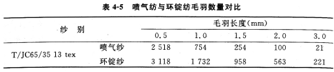 由于喷气纱是表面纤维头端包缠结构,其毛羽具有方向性,顺纱线前进方向。因此筒子纱可直接用于纬纱,不易多倒筒。同时也导致其摩擦性能具有方向性,纱线从筒子退出的行进方向(顺毛羽方向)的耐磨性远大于反向,在5:1—10:1之间。喷气纱3mm以上的毛羽比环锭纱少80%左右,但短毛羽多,如表4-5所示。