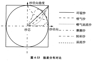 喷气纺的各截面加捻程度,也与其他纱线不同,图4—33所示为各种纱线截面加捻程度对比图。