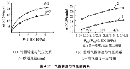 实验证明气圈转速随气压增加而加快,如图4—17所示(测试条件:纺13.1tex、65/35T/C纱,纺纱速度140m/min,喂入比0.98)。
