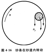 须条从吸口进入纱道内,在高速旋转的涡流场作用下,受气流推动旋转而加捻。由于纱条密度ρy远大于空气密度,在离心力作用下,纱条向外侧运动,到达离心力(向外)与涡流场压差(向内)的平衡位置(即靠近管壁)时,纱条旋转方向与气流旋转方向相同(公转)而加捻,如图4—16所示。