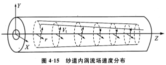 旋转气流的中心压力低于外层压力,形成负压,加上旋转气流的轴向分速度作用,吸嘴具有一定吸力,使前罗拉输出的纤维能顺利吸人加捻器吸口中。纱道内涡流场的速度分布由切向速度、轴向速度和径向速度组成,如图4—15所示。