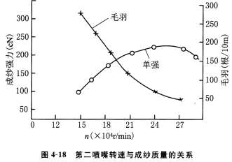 如上所述,第一喷嘴与第二喷嘴形成的气圈不能相互干扰且要合理匹配。第一喷嘴的气圈转速会影响第一喷嘴与前罗拉钳口之间的纱条张力及波动,决定头端自由边纤维的产生数量,即包缠纤维的多少。第二喷嘴的气圈转速决定加捻包缠效果,与成纱强度和纱线质量有密切关系,如图4—18所示。从图中可见,成纱强度随气圈转速增加而提高,达到某值后,强度反而有所下降。因此必须合理选择和匹配两者的关系,提高成纱质量的同时,降低能耗和气耗。