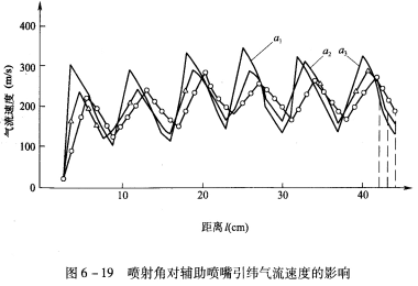 3.辅助喷嘴喷射角对引纬气流速度的影响喷射角是辅助喷嘴射流的轴心线与筘槽轴心线的交角,它反映了辅助喷嘴补充的气流与筘槽内主气流夹角的大小。图6—19是在辅助喷嘴间距为70mm条件下,三种喷射角引纬气流速度的分布情况,其中a1>a2>a3。可见,当喷射角大时,引纬气流速度的峰值高,峰值出现的位置靠前,即距辅助喷嘴的水平距离短,但速度衰减也快。反之,当喷射角小时,气流速度的峰