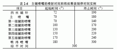 主辅喷嘴的喷射时间(电磁阀的开闭时间)和纬丝释放制停时间(储纬器上挡丝磁针的开闭时间)要严密配合。如图2-20所示,电磁阀和储纬器上挡丝磁针的开闭时间由电脑控制中心1输入并自动监控。主辅喷嘴的喷射时间和纬丝释放制停时间配合实例如图2-21和表2-6所示。